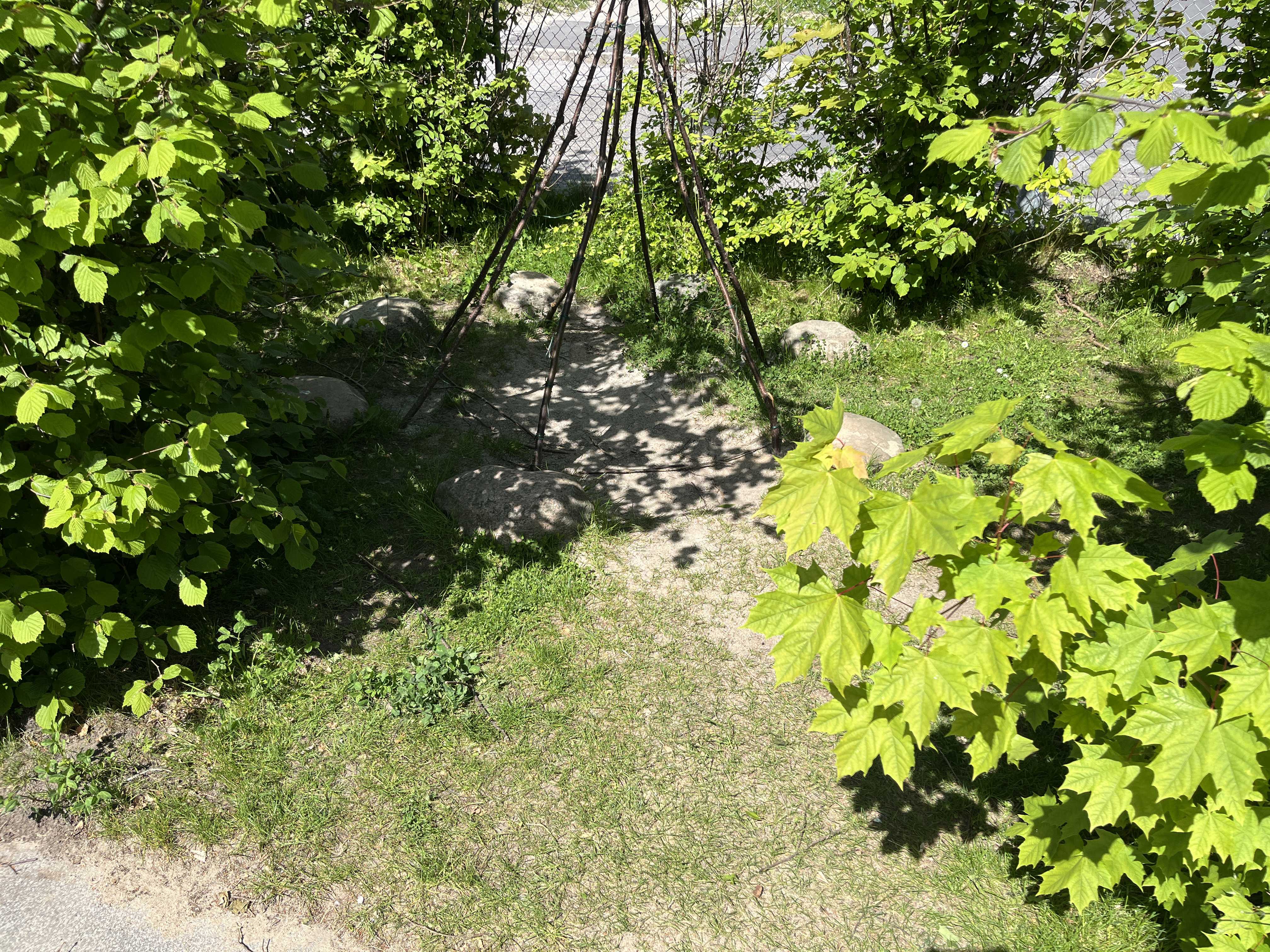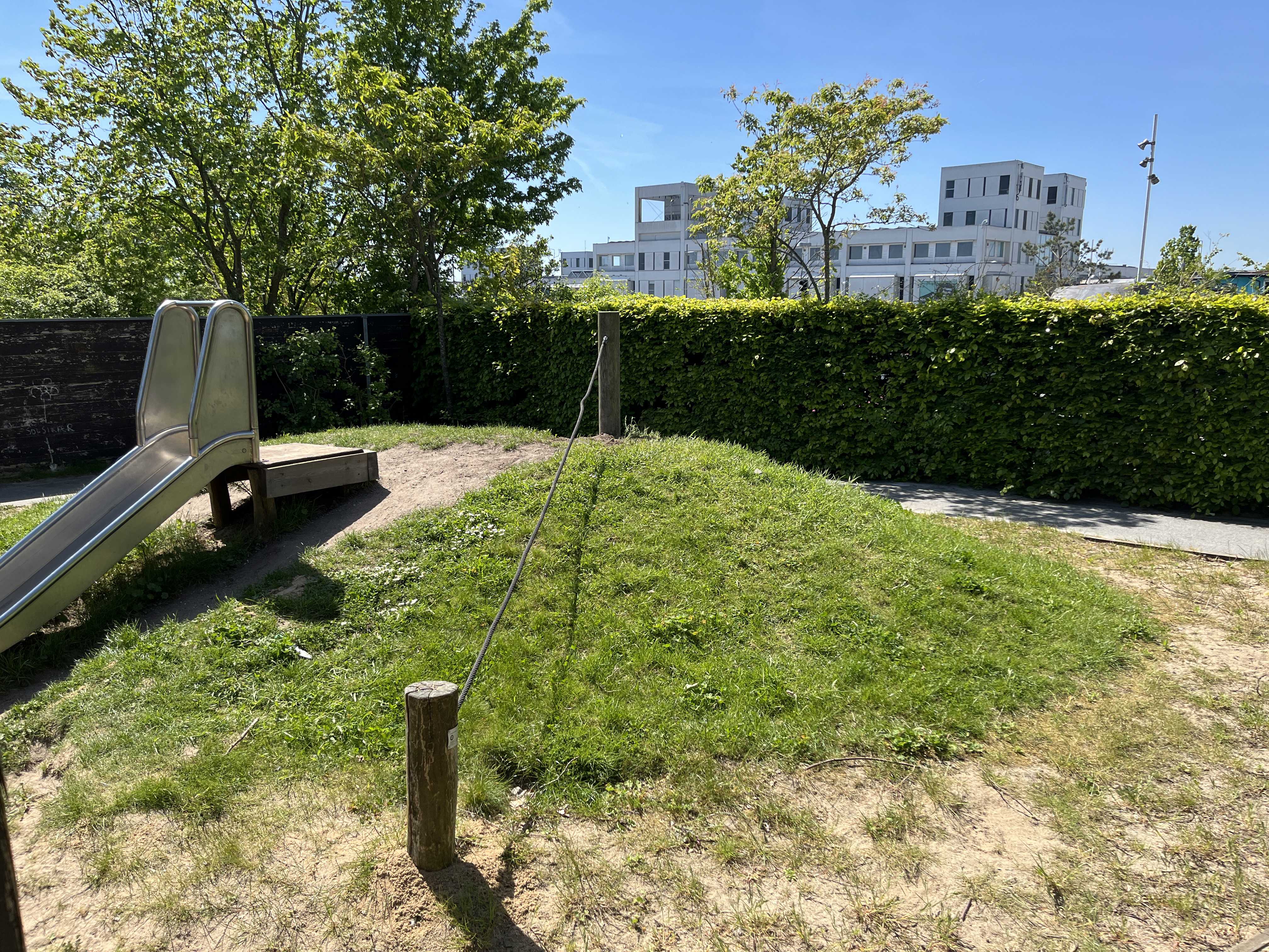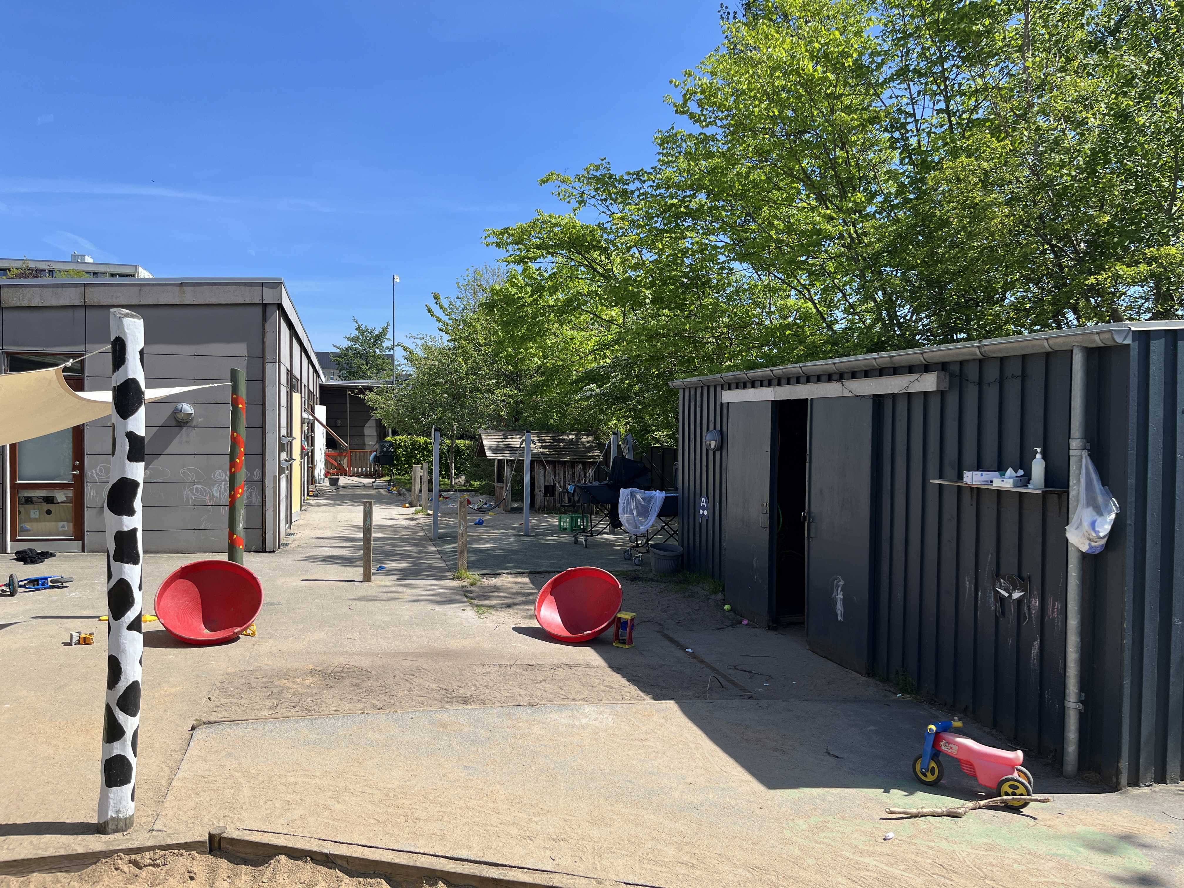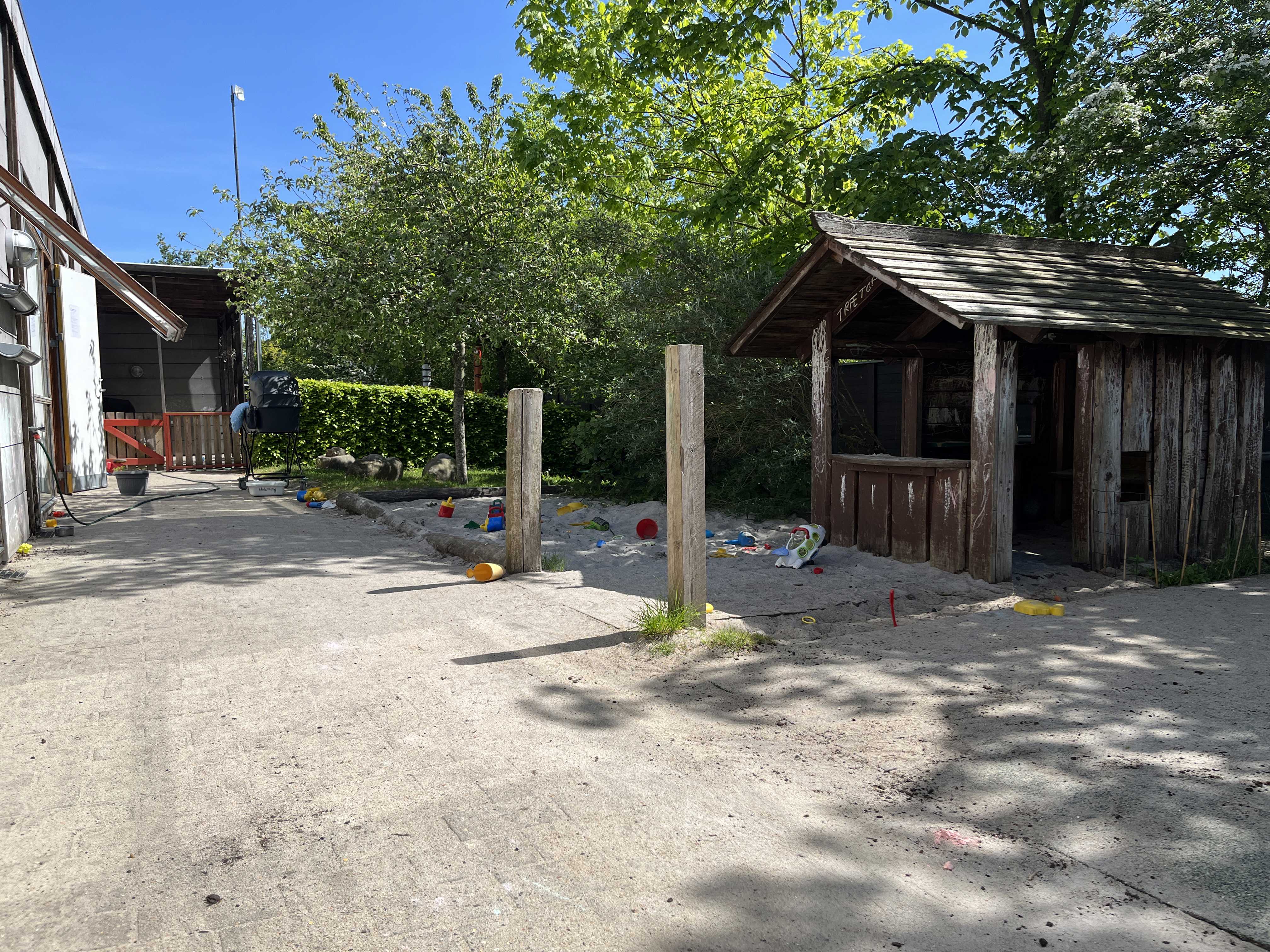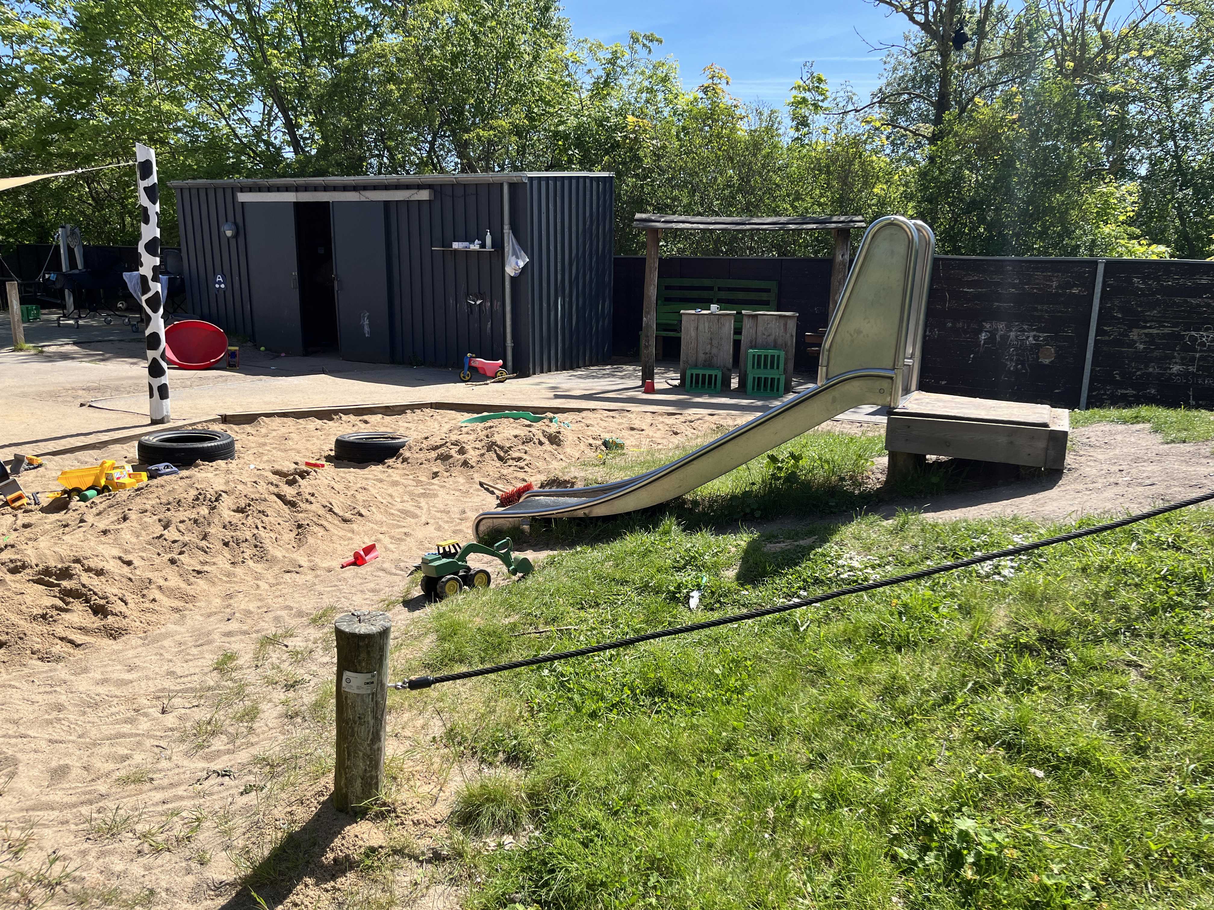 Vores legeplads byder på små hyggelige kroge, frugttræer og -buske, og er tilpas overskuelig for et lille vuggestuebarn, samtidig med den også er stor nok til at gå på opdagelse i for de større børnehavebørn.