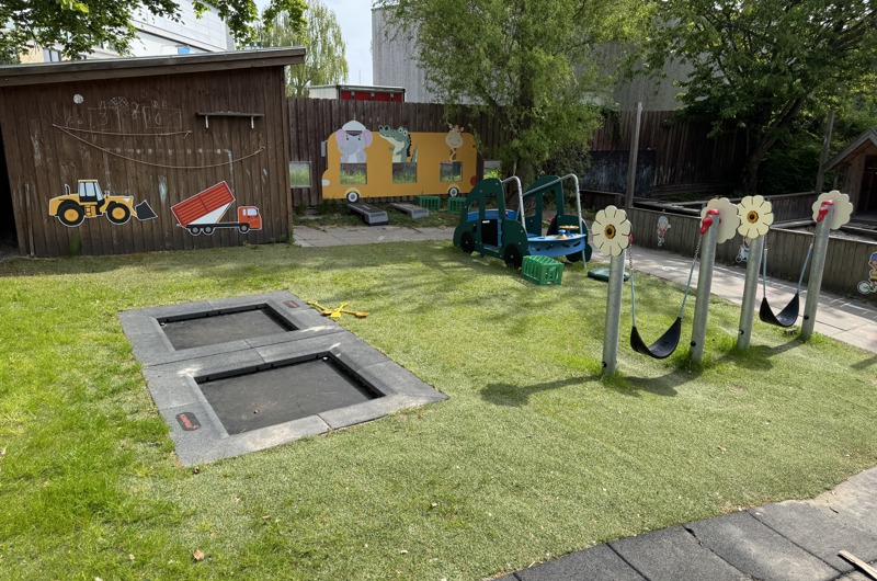 Vi har en mindre legeplads, med gynger, sandkasse, legehus, rutsjebane, m.m. Vi bruger legepladsen hver dag, her summer der næsten altid af liv. Børnene har mulighed for at køre på scootere og cykler, vi laver ofte bål og bruger generelt legepladsen til mange forskellige aktiviteter og lege.